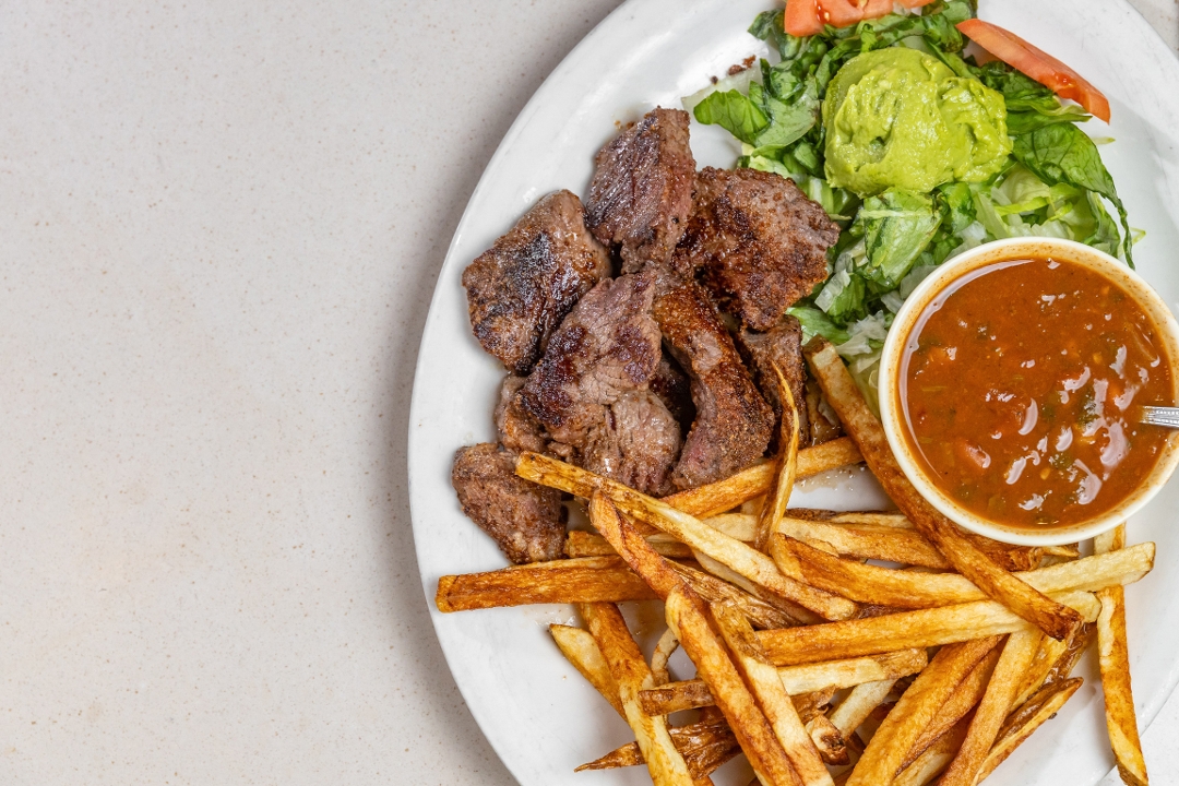 Stew Meat simmered in a Seasoned Sauce, served with Beans, Rice, choice of Tortillas, and choice of Salad or Cole Slaw.