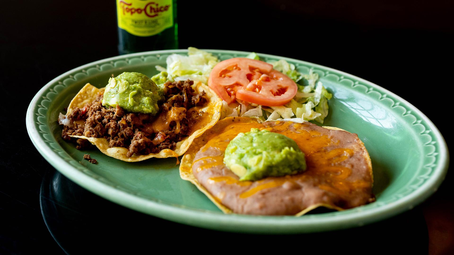 Two Chalupas, one Beef, one Bean, both topped with Cheese and Guacamole.